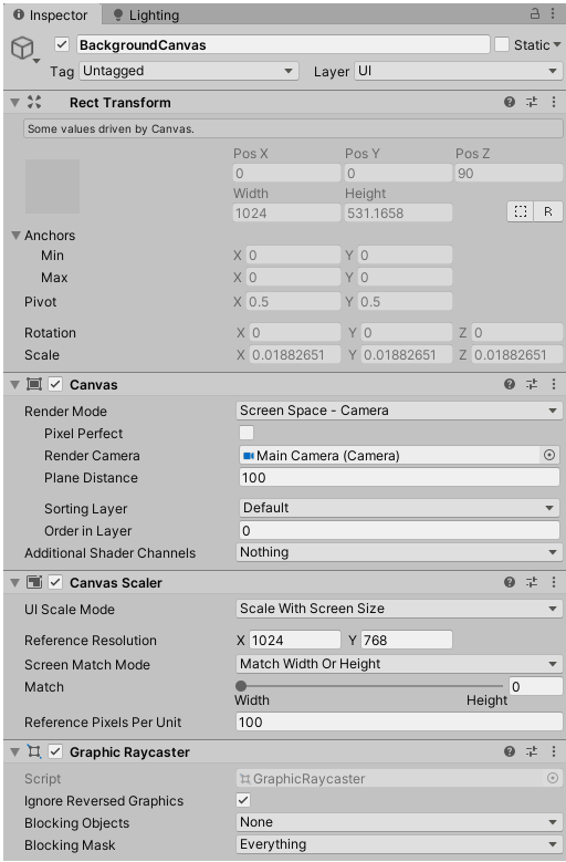 Trong BackgroundCanvas, chúng ta cần đặt Chế độ kết xuất của nó là Không gian màn hình. Sau đó, chúng ta sẽ đặt Chế độ tỷ lệ giao diện người dùng của nó thành Tỷ lệ theo kích thước màn hình. Bằng cách này, Canvas sẽ xuất hiện ở chế độ nền chứ không phải ở phía trước các đối tượng khác.