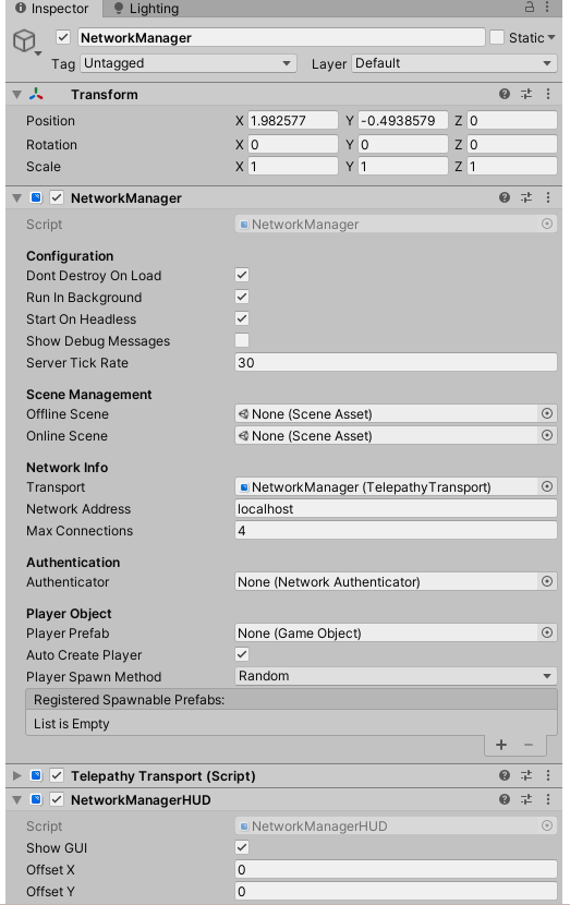 Để có một trò chơi nhiều người chơi, chúng ta cần một GameObject với các thành phần NetworkManager và NetworkManagerHUD, vì vậy hãy tạo một cái.
