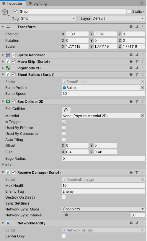 Hiện tại, con tàu sẽ chỉ di chuyển theo chiều ngang trên màn hình, với vị trí của nó được cập nhật bởi Trình quản lý mạng.Vì vậy, trước hết, hãy tạo một GameObject mới có tên là Ship và biến nó thành một nhà lắp ghép. Hình dưới đây cho thấy các thành phần nhà lắp ghép Ship, mà tôi sẽ giải thích ngay bây giờ.