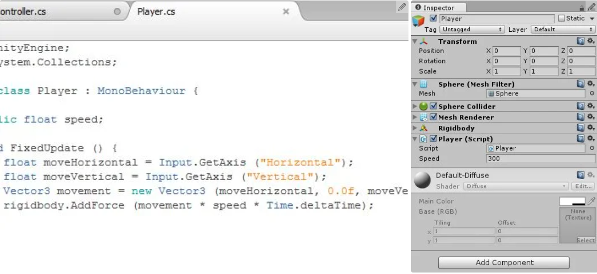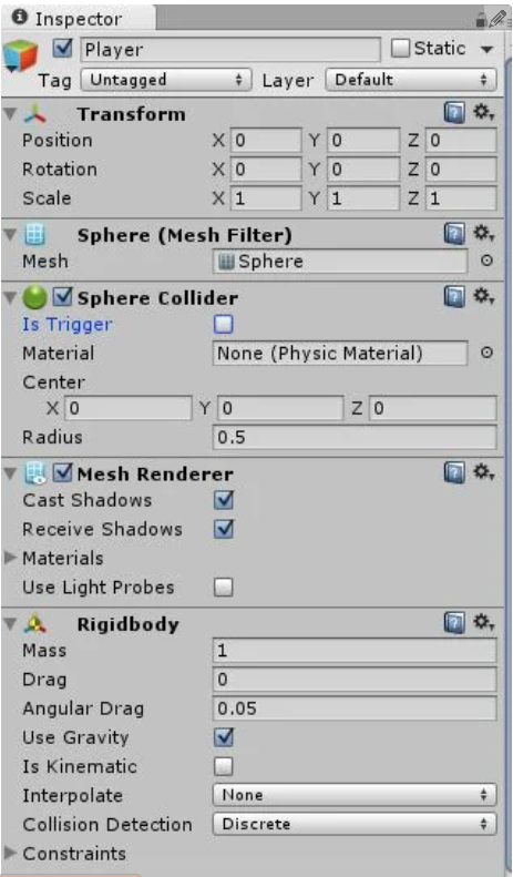 Bây giờ chúng ta cần vật lý. Làm cho trình phát tuân theo các định luật vật lý bằng cách nhấp vào Thêm thành phần ở cuối bảng Thanh tra với trình phát được chọn. Thêm Vật lý – Rigidbody. Để lại tất cả các cài đặt mặc định.