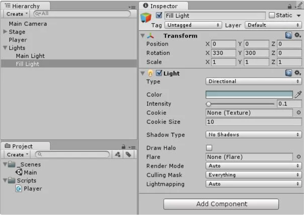 Tạo ánh sáng định hướng bằng cách chọn tùy chọn từ thanh công cụ “tạo” trong bảng Phân cấp. Đặt tên cho nó là “Ánh sáng chính”. Biến nó thành một đối tượng con của Lights bằng cách kéo nó trong Hệ thống phân cấp vào đối tượng trò chơi Lights.