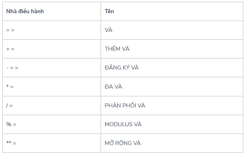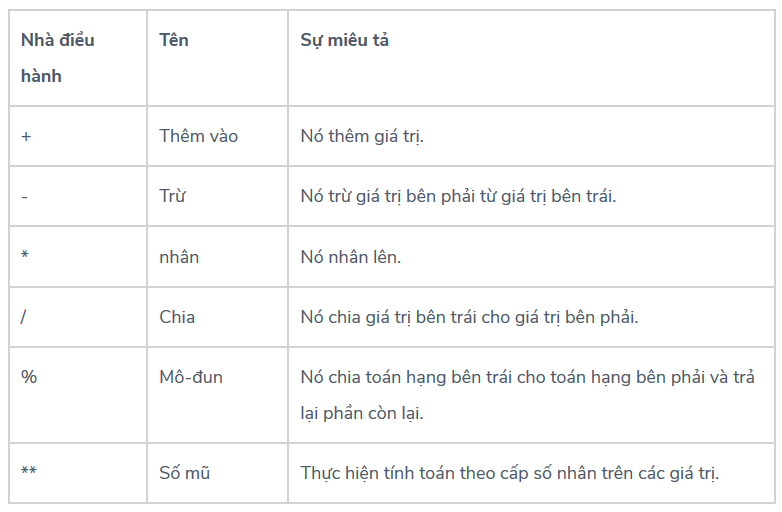 Các loại toán tử được sử dụng bởi Python được liệt kê dưới đây: