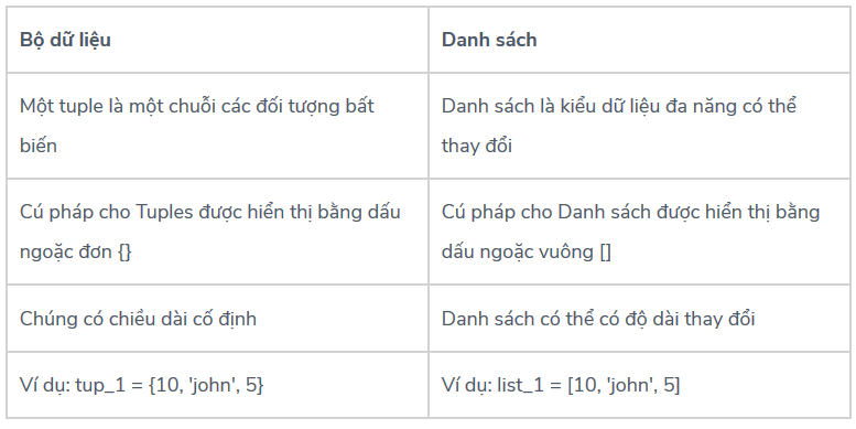 Sự khác biệt chính là bộ dữ liệu là bất biến trong khi một danh sách có thể thay đổi. Điều đó có nghĩa là một khi bạn tạo tuple, bạn không thể chỉnh sửa hoặc thay đổi giá trị trong tuple trong khi trong danh sách chúng ta có thể chỉnh sửa giá trị trong đó.