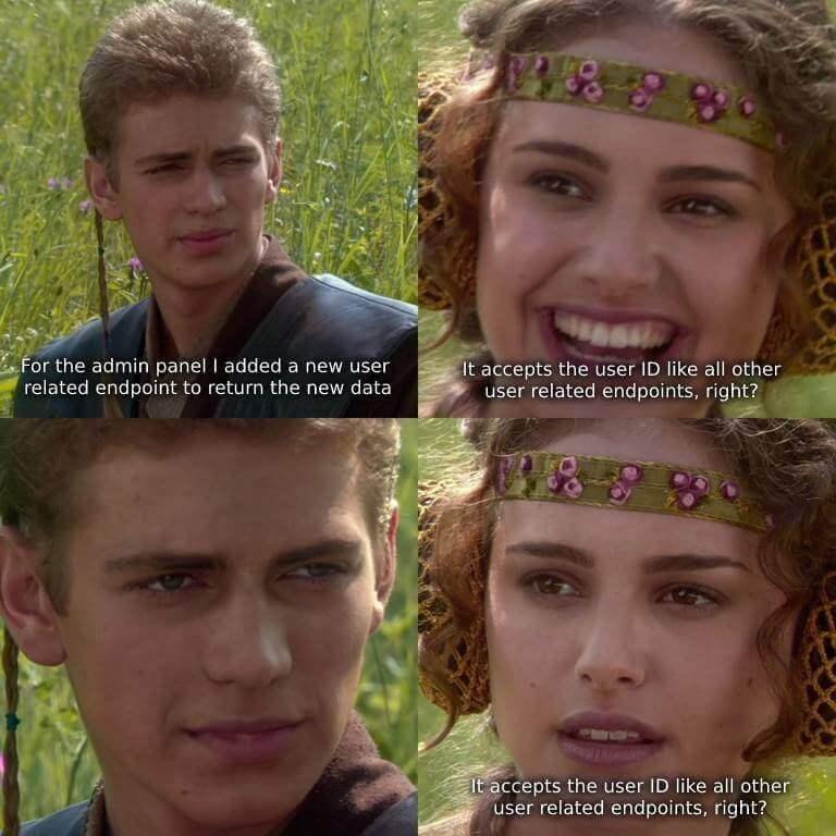 Bạn cũng có thể chấp nhận các đối số của các dạng hoàn toàn khác nhau trong tất cả các hàm. Hay giống như meme trên đây. Hãy để một chỉ số chấp nhận user ID nhưng số khác lại chấp nhận cả đối tượng là người dùng (Kể cả khi chúng chỉ cần ID). Hay có lẽ bạn sẽ tìm ra cách để chấp nhận cả email của người dùng ? Lập trình viên nào mà làm việc theo sau bạn thì sẽ không được vui vẻ lắm đâu.