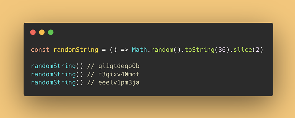 const randomString = () => Math.random().toString(36).slice(2)randomString() // gi1qtdego0b