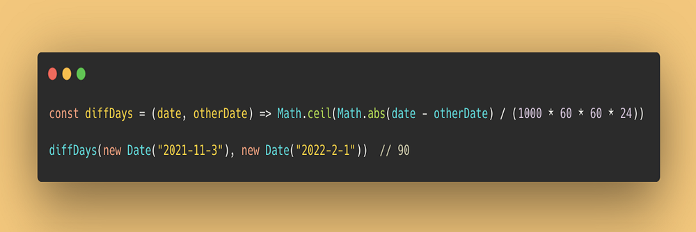const diffDays = (date, otherDate) => Math.ceil(Math.abs(date - otherDate) / (1000 * 60 * 60 * 24));diffDays(new Date("2021-11-3"), new Date("2022-2-1")) // 90