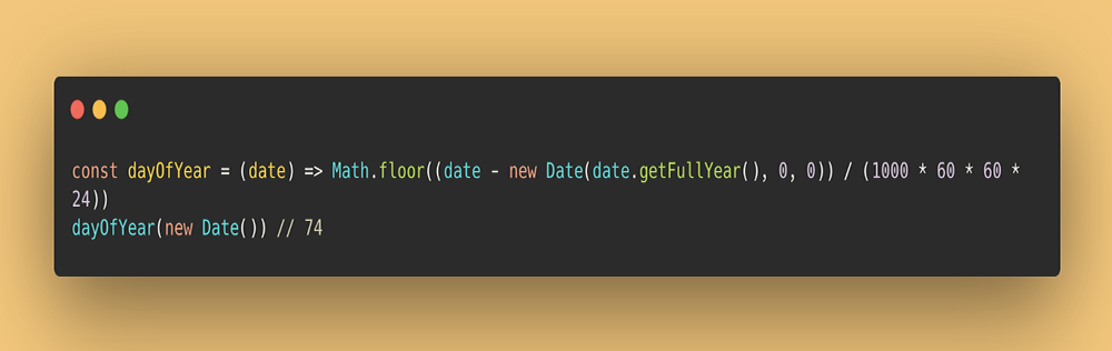 const dayOfYear = (date) => Math.floor((date - new Date(date.getFullYear(), 0, 0)) / (1000 * 60 * 60 * 24))dayOfYear(new Date()) // 74