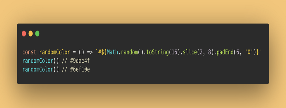 const randomColor = () => `#${Math.random().toString(16).slice(2, 8).padEnd(6, '0')}`randomColor() // #9dae4f