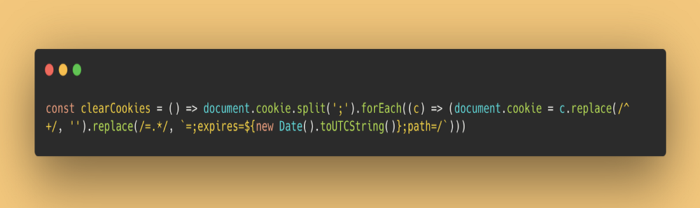 const clearCookies = () => document.cookie.split(';').forEach((c) => (document.cookie = c.replace(/^ +/, '').replace(/=.*/, `=;expires=${new Date().toUTCString()};path=/`)))