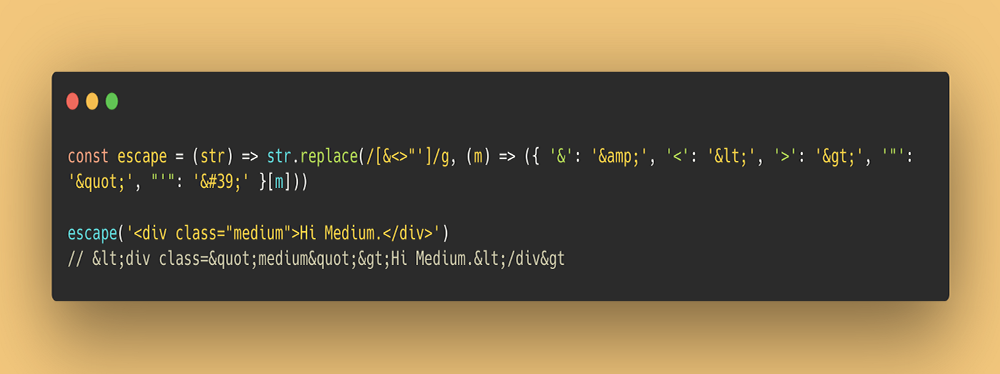 const escape = (str) => str.replace(/[&<>"']/g, (m) => ({ '&': '&', '<': '<', '>': '>', '"': '"', "'": ''' }[m]))escape('<div class="medium">Hi Medium.</div>')