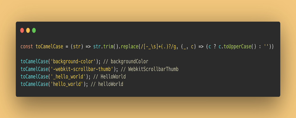 const toCamelCase = (str) => str.trim().replace(/[-_\s]+(.)?/g, (_, c) => (c ? c.toUpperCase() : ''));toCamelCase('background-color'); // backgroundColor