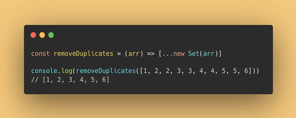 const removeDuplicates = (arr) => [...new Set(arr)]console.log(removeDuplicates([1, 2, 2, 3, 3, 4, 4, 5, 5, 6]))
