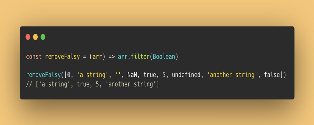 const removeFalsy = (arr) => arr.filter(Boolean)removeFalsy([0, 'a string', '', NaN, true, 5, undefined, 'another string', false])