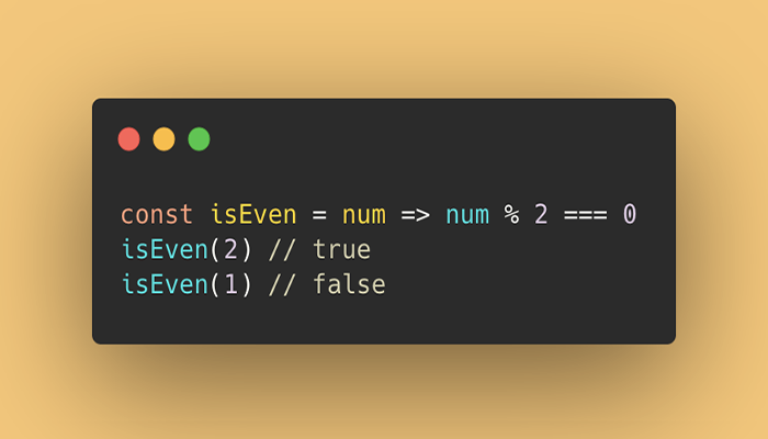 const isEven = num => num % 2 === 0isEven(2) // true