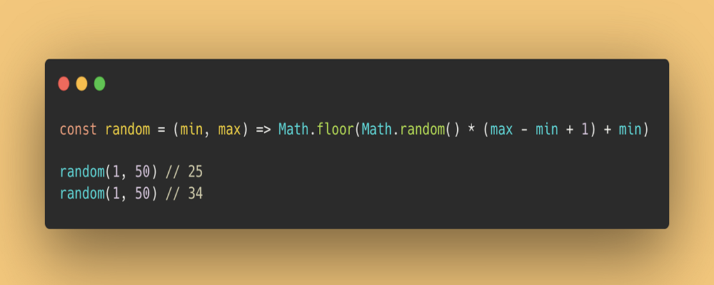 const random = (min, max) => Math.floor (Math.random () * (max - min + 1) + min)random (1, 50) // 25