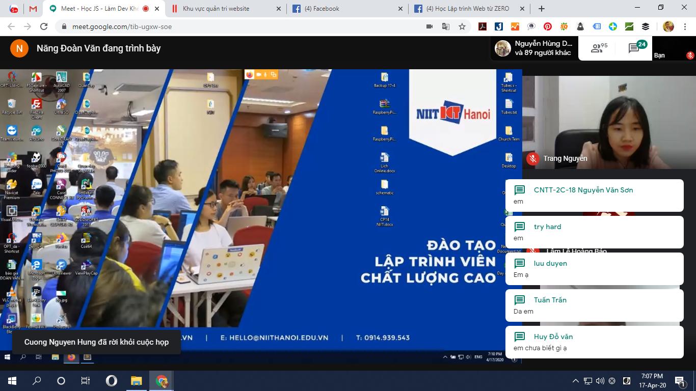 Hôm nay, ngày 17/4/2020, NIIT-ICT Hà Nội tổ chức buổi 1 trong chương trình “Học JS-Làm Dev Khét”- chương trình bổ trợ kiến thức cho các bạn sinh viên.