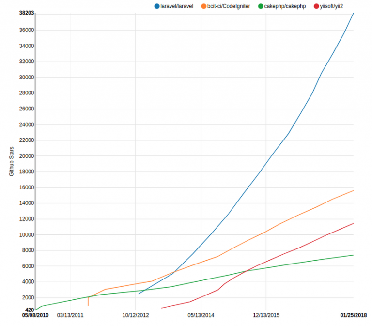 Mặc dù ra đời muộn hơn so với các đối thủ, tuy nhiên Laravel đã thật sự tạo thành một làn sóng lớn, được đánh giá tốt và sử dụng rộng rãi nhất hiện nay. Biểu đồ dưới đây cho thấy sự tăng trưởng về số lượng sao trên Github của Laravel so với các Framework khác