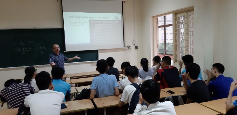 Chia sẻ với các bạn SV là TS. Nguyễn Hữu Xuân Trường - cự SV K45 của khoa Toán Cơ Tin, hiện đang là GV bộ môn Python tại NIIT-ICT HN, người đã có nhiều kinh nghiệm lập trình, nhiều đề tài khoa học đã được công bố. Theo TS. Nguyễn Hữu Xuân Trường, hiện nay Python đang là ngôn ngữ rất phổ biến mà lại hiệu quả cho việc học tập của SV, dễ dàng tiếp cận nghiên cứu. Hiện nay, Python đang là ngôn ngữ có sự tăng trưởng cao nhất sau đó là Java, Javascript. SV nắm được sẽ có được cơ hội tốt cho sau này.