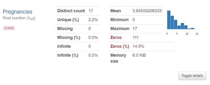 Đây là thông tin được tạo cho biến được gọi là “Pregnancies.”