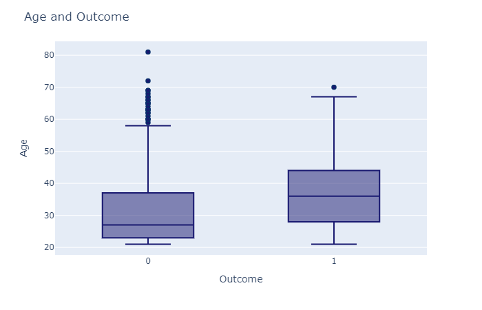 Từ biểu đồ hộp ở trên, chúng ta có thể thấy rằng BMI cao hơn tương quan với một kết quả tích cực. Những người bị tiểu đường có xu hướng có chỉ số BMI cao hơn những người không bị tiểu đường.