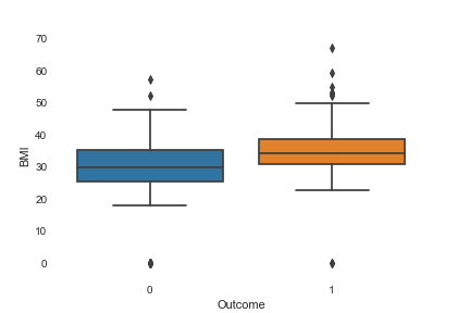 Cuối cùng, chúng ta sẽ trực quan hóa các biến “ BMI ” và “ Outcome ”, để xem liệu có mối tương quan nào giữa hai biến hay không.