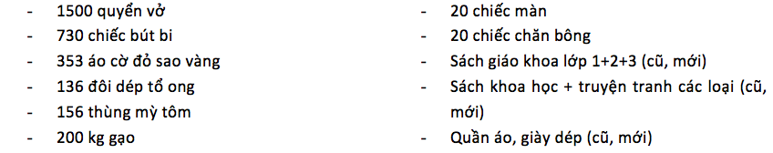 - Quần áo, giày dép có thể là đồ cũ nhưng ko rách, còn sử dụng được và phù hợp với đồng bào dân tộc miền núi. Vui lòng gấp, xếp và đảm bảo đồ quyên góp sạch sẽ trước khi đóng gói