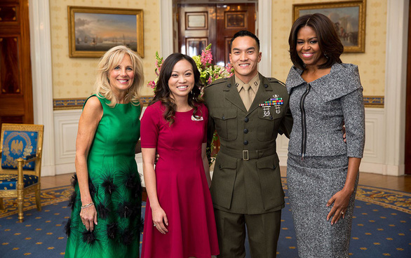 Phu nhân tổng thống Michelle Obama (bìa phải), tiến sĩ Jill Biden - phu nhân phó tổng thống Joe Biden (bìa trái) chào đón Kathy Phạm đến dự lễ đọc thông điệp liên bang của tổng thống cùng em trai David Phạm ngày 20-1-2015 - Ảnh: Nhà Trắng
