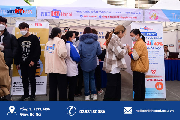 Tham gia ngày hội tại đây, một số hoạt động tiêu biểu của NIIT-ICT Hà Nội có thể kể đến như: tư vấn, định hướng nghề cũng như phương án học tập đối với thanh niên, sinh viên có đam mê trong lĩnh vực CNTT. Hỗ trợ, giải đáp những thanh niên đang thể hiện mong muốn tìm hiểu về lĩnh vực và giải pháp về việc làm của chính bản thân mình. Cũng nhân dịp sự kiện này, NIIT-ICT Hà Nội tạo ra sân chơi kết nối cộng đồng yêu thích CNTT, các mối quan hệ gắn kết với những doanh nghiệp đối tác để tạo ra nhiều cơ hội việc làm hơn cho học viên.