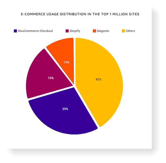 Theo trang Builtwith, Magento đứng thứ 3 trong top 1 triệu trang dẫn dầu về các nền tảng thương mại điện tử trên Internet. Đặc biệt, 10 trong số 100 cửa hàng online hàng đầu chọn Magento làm nên tảng thương mại điện tử của họ. Thị phần của Magento có vẻ không quá ấn tượng, nhưng cũng đủ đế đứng thứ 3 trong bảng xếp hạng. Bạn có thể tham khảo các thống kê về mức độ sử dụng Magento được thực hiện bởi trang Builtwith để biết thêm thông tin.