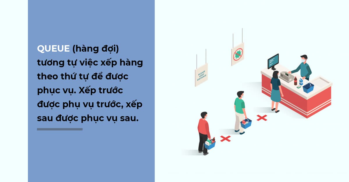 Queue (hàng đợi) là một danh sách các phần tử có thứ tự, được xếp hàng.